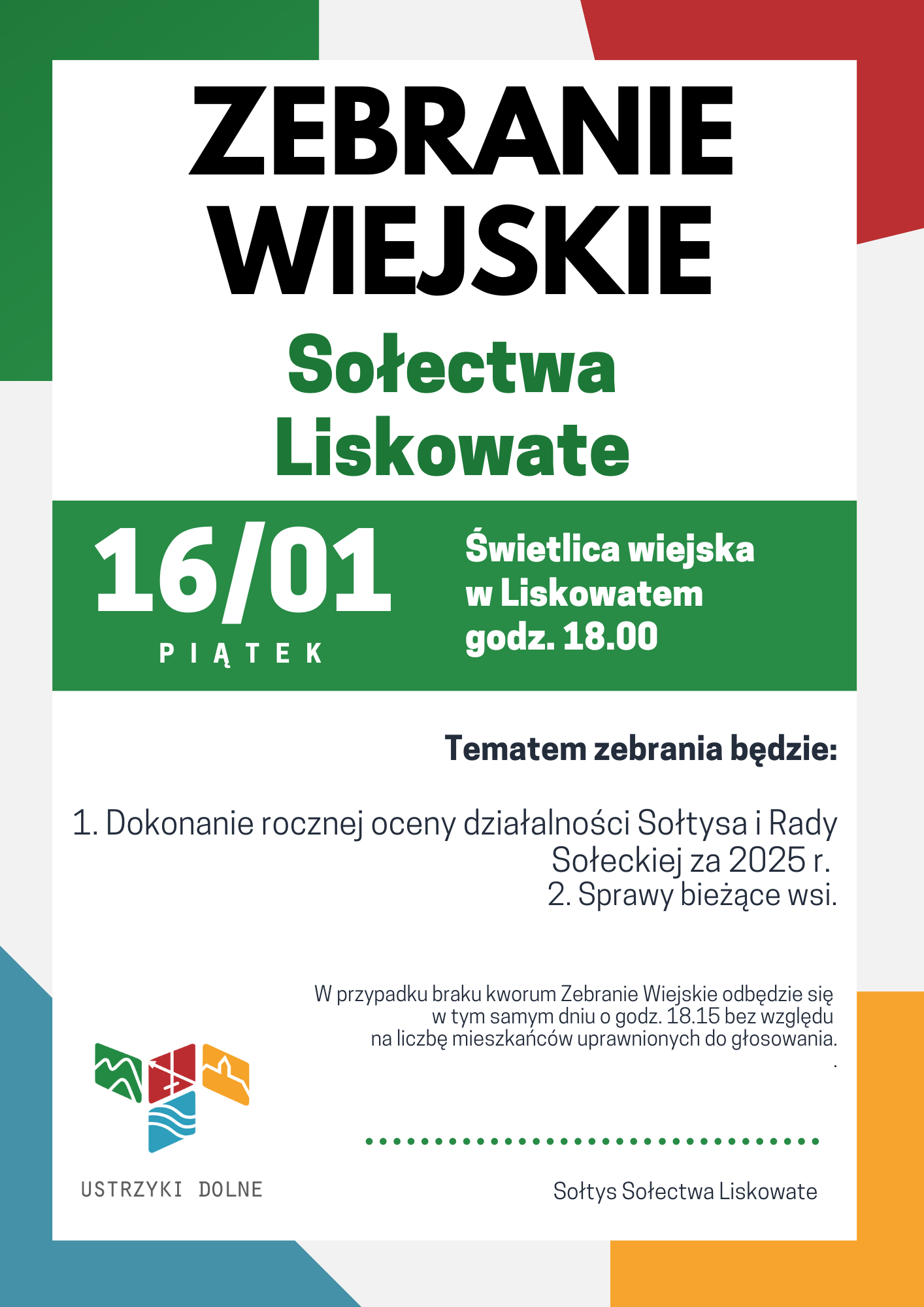 Zebranie wiejskie Sołectwa Liskowate 08-01-2026Data publikacji, 08-01-2026, Marcin OrganAutor, Marcin Organ, 38Ilość wyświetleń, 38